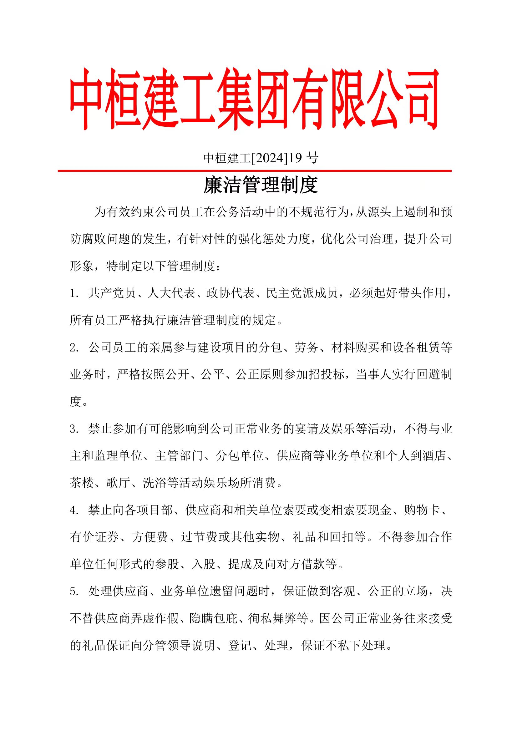 中桓建工集團(tuán)發(fā)布最新廉潔管理制度
